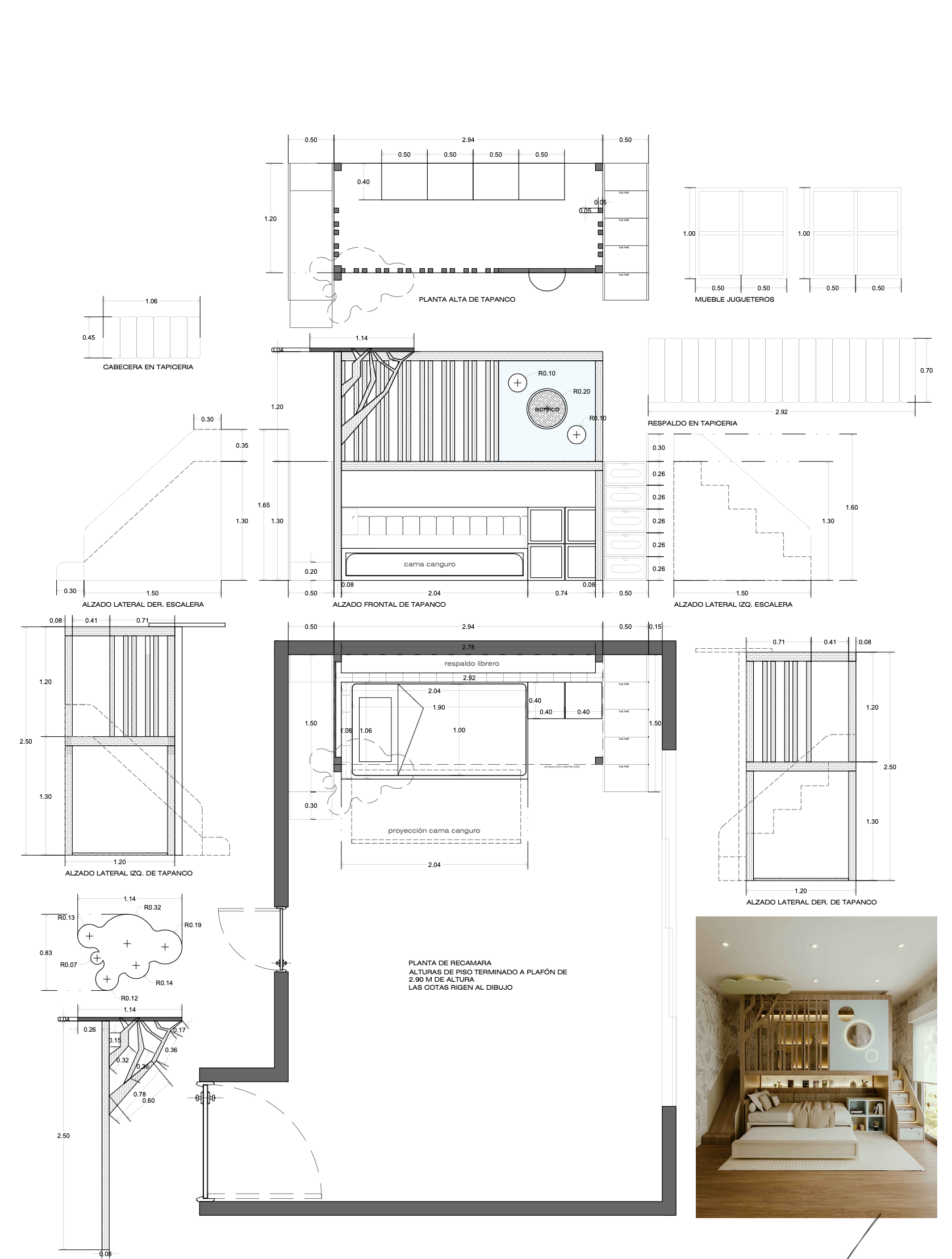 - Por qué lo hacemos: Porque entendemos que los metros cuadrados son valiosos. En este plano de precisión, aprovechamos la altura de 2.90m para crear un sistema de doble nivel que duplica la utilidad del cuarto.