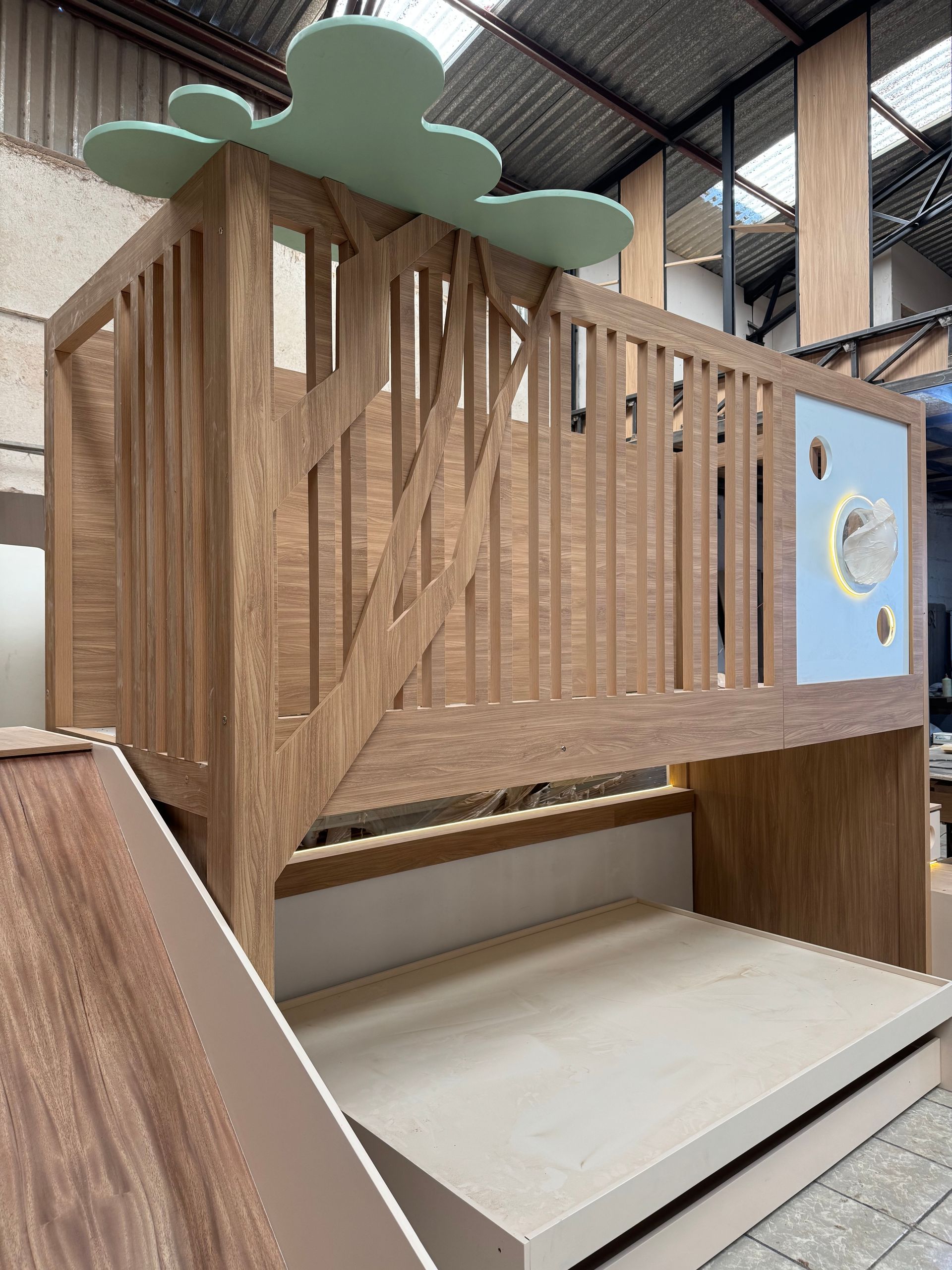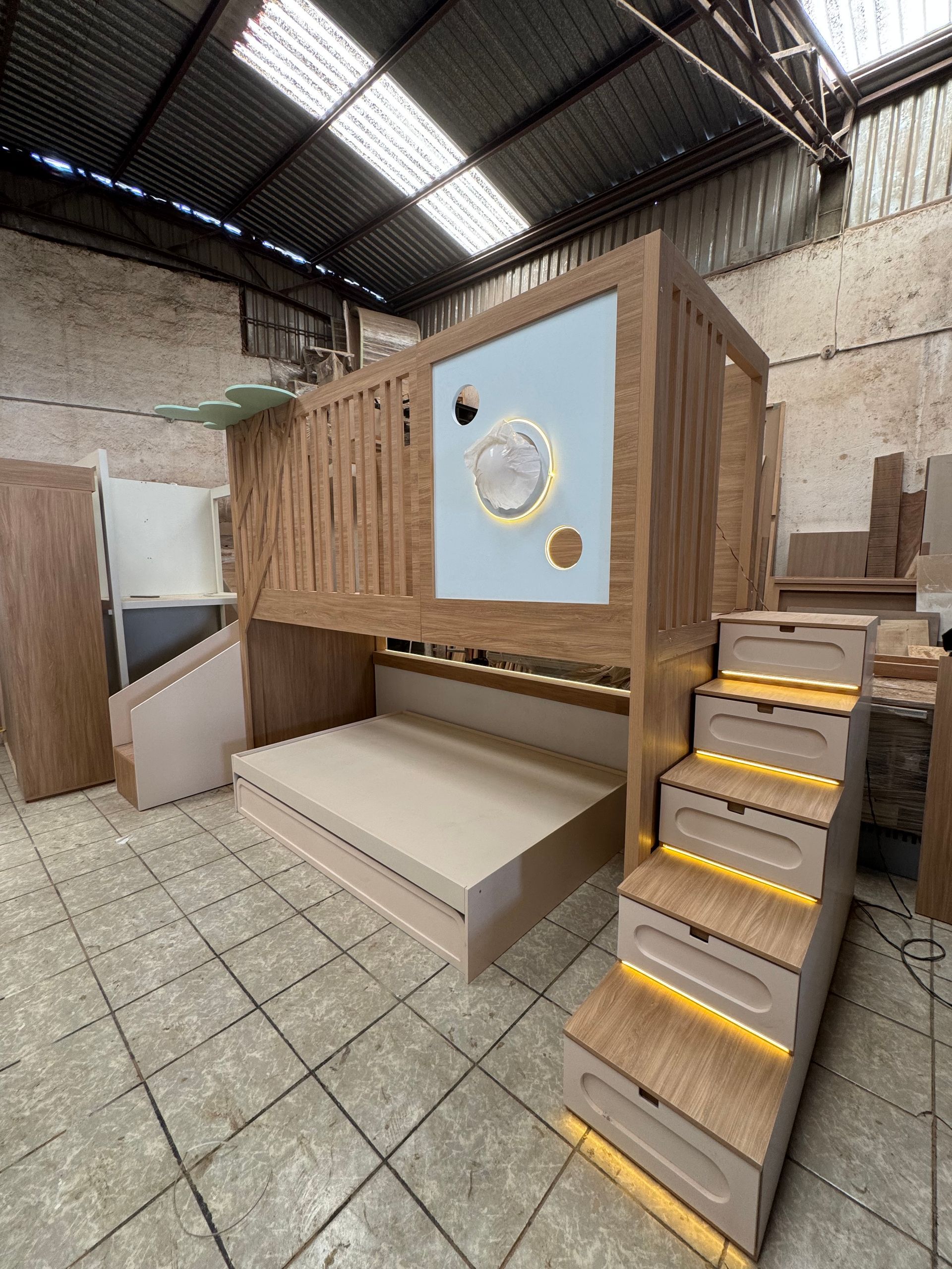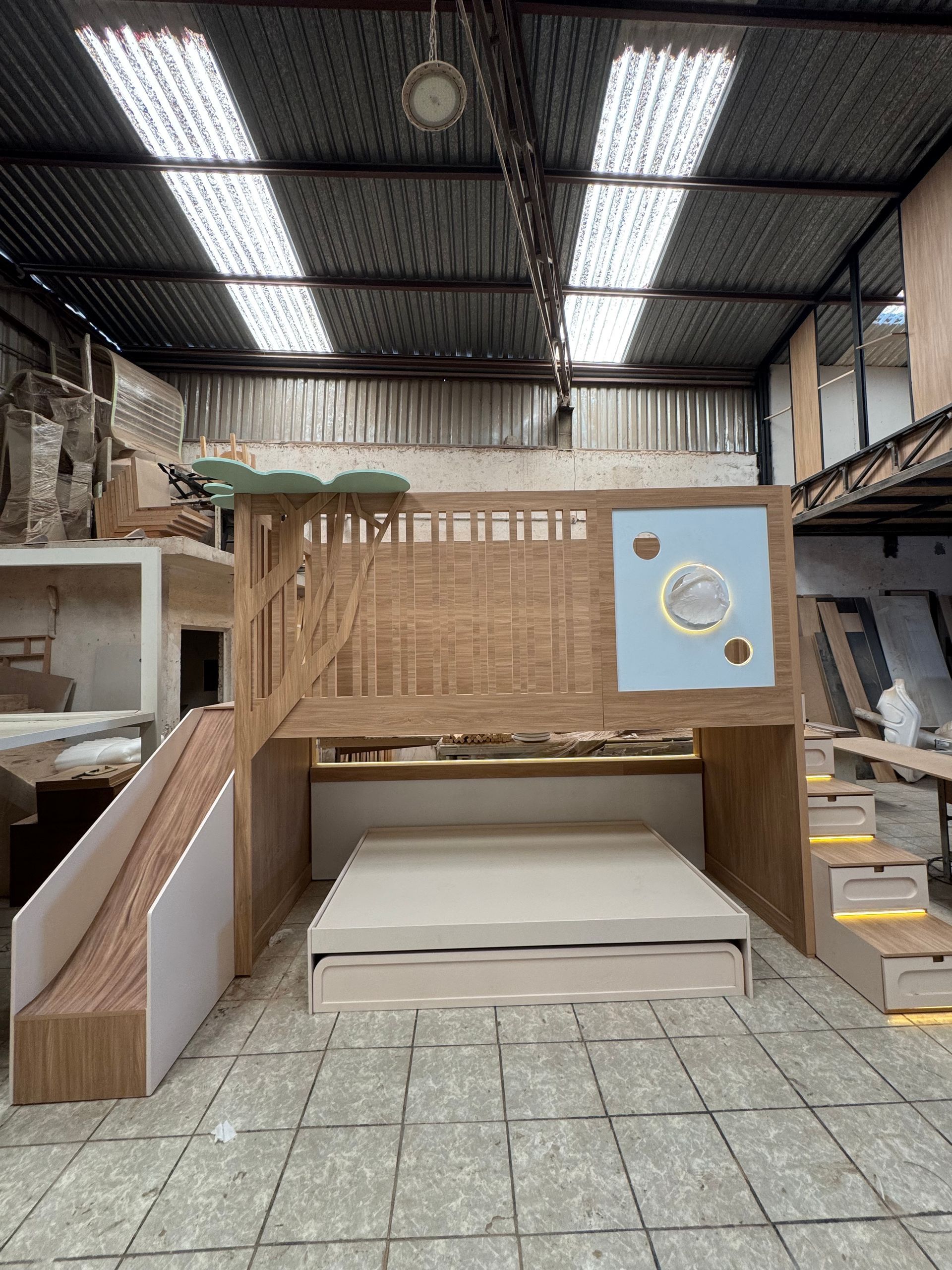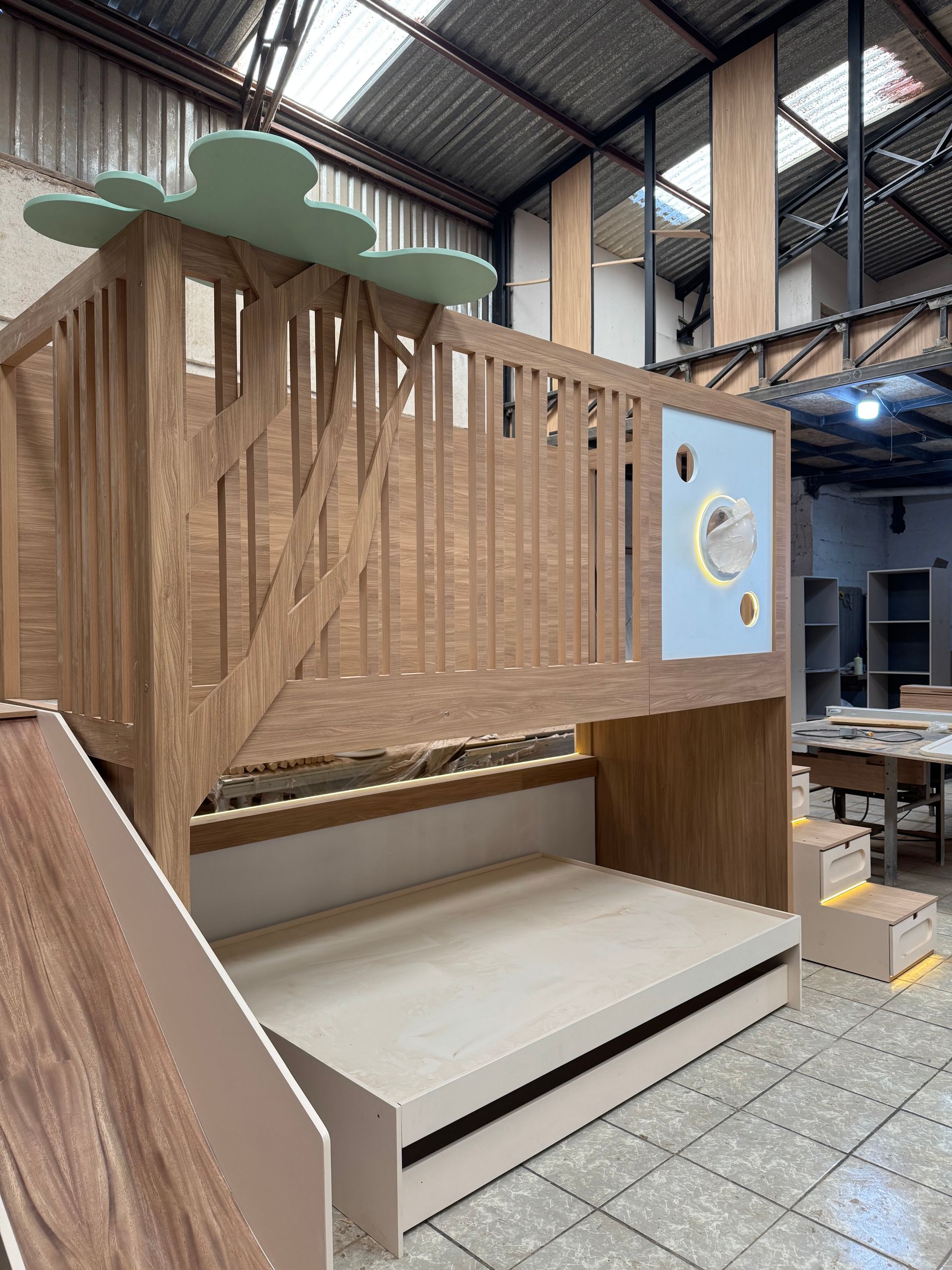 - Logística de Juego y Orden: Hemos convertido una habitación en un parque de diversiones privado y un centro de organización masivo. Con cajones integrados en cada escalón y nichos de fácil acceso, el diseño enseña al niño a habitar su espacio de forma autónoma. Es una pieza única, fabricada con acabados de alta gama, que crece junto a tu hijo, adaptándose a sus nuevas etapas de vida.